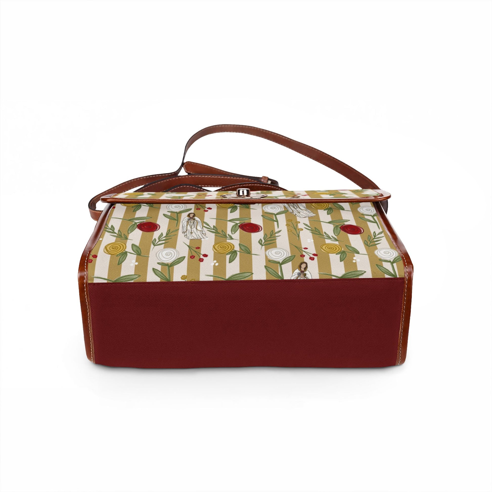 A waterproof canvas bag with an Our Lady of Rosa Mystica floral pattern and warm PU leather trim. The structure holds its shape while the removable shoulder strap and top handle let you switch from crossbody to hand carry in seconds. Inside, two pockets — one zippered — keep a phone, keys, and a small wallet organized. This bag works for days at Church, rainy commutes, or slow weekend escapes when you want something reliable that still looks like you put thought into it.